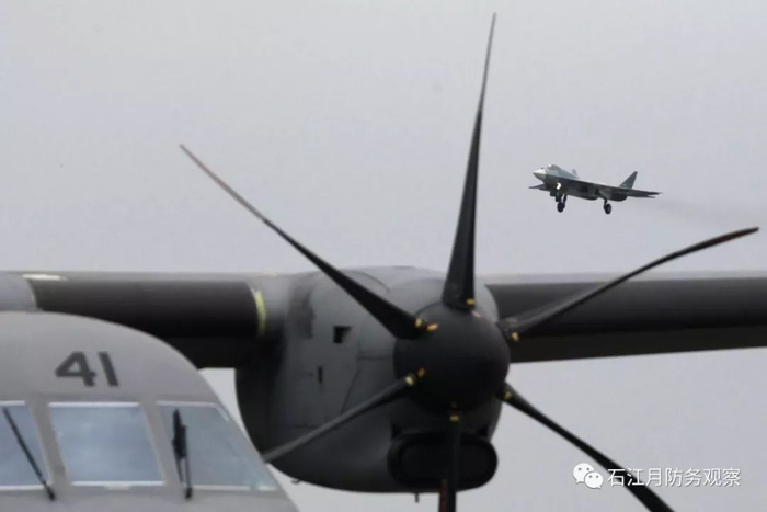 这架苏-57战斗机飞在一架安-12运输机后面,飞机在下降时可以轻松应对安-12运输机带来的气流变化,先是下降到400米,然后下降到300米,最后突然从安-12运输机的下面加速穿过。
