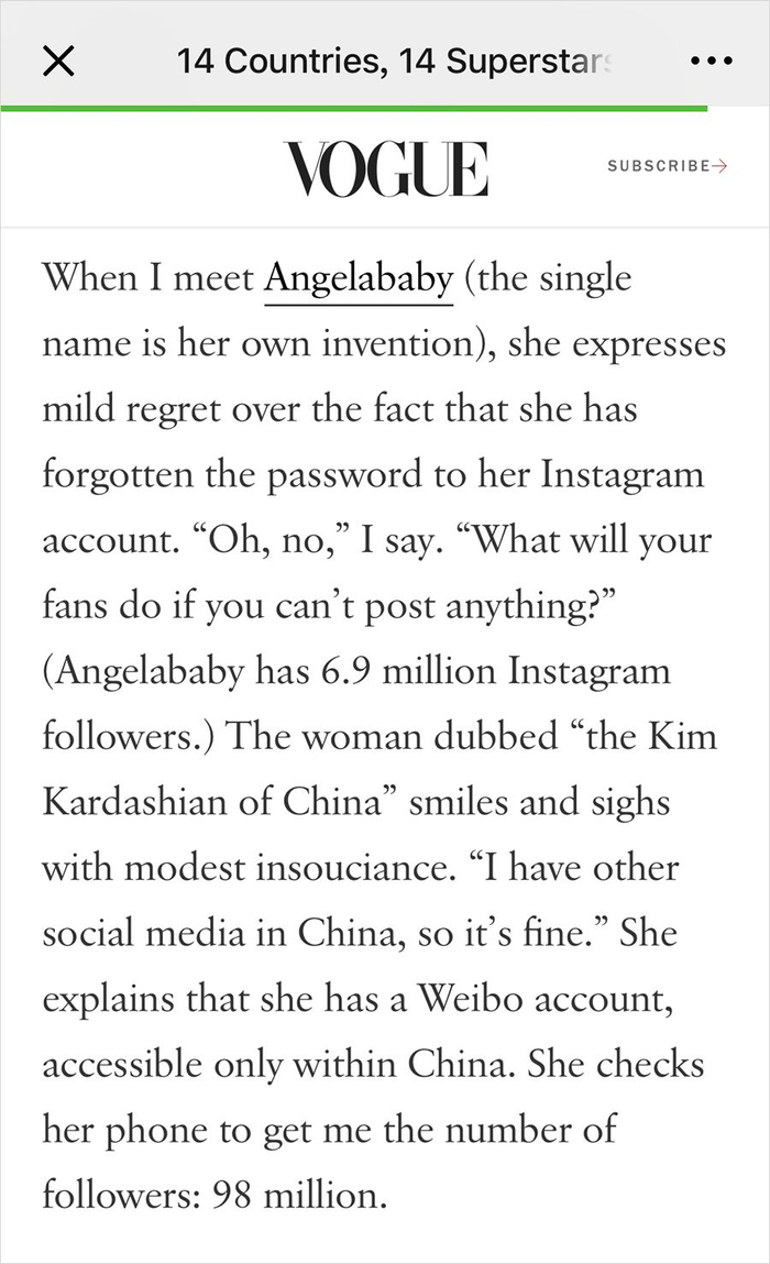 所以大概Vogue的编辑也心知肚明,Angelababy身上唯一能拿出来说的也就是她在社交媒体上的粉丝数。