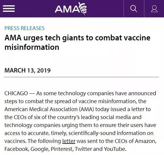 这封信的内容,是向亚马逊、Facebook、谷歌、Pinterest、Twitter和YouTube等互联网企业的首席执行官求助,请求他们帮忙阻断错误信息的传播,制止“反疫苗”运动,称这场运动已导致部分疾病发病率在美国大幅上升,并对公共健康构成威胁。