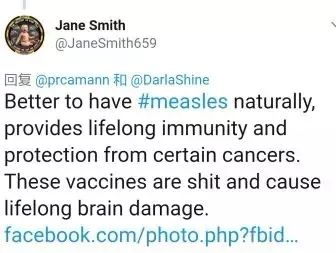 “宁愿自然地患上麻疹,这样能帮助你终生免疫并预防某些特定的癌症。这些疫苗就是屎,还会带来永久性脑损伤。”