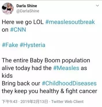 “整个人口爆炸时代出生并得过麻疹的人到今天都还活着。让孩童时代的疾病回来吧,这样会让你更健康,而且还能抗癌。”