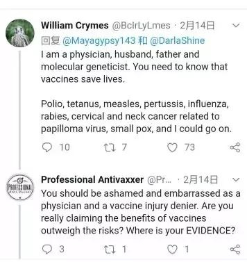 “我是一名医生、丈夫、父亲和分子遗传学家,你要知道疫苗是能救命的。脊髓灰质炎、破伤风、麻疹、百日咳、流感、狂犬病、乳头状瘤病毒、天花等等,我还能举很多例子。”