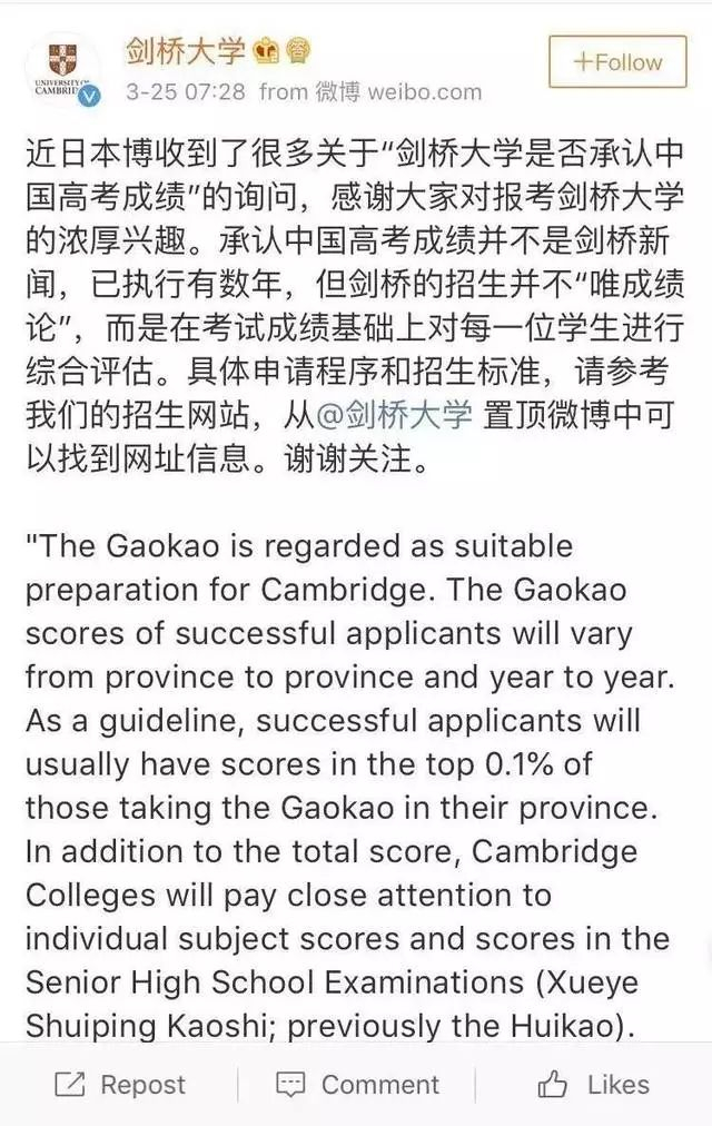 就在昨天,剑桥大学的官博发了一条微博回应这一消息,剑桥大学早有针对中国考生的录取政策,已经执行了数年,但剑桥的招生并不“唯成绩论”,而是在考试成绩基础上对每一位学生进行综合评估。