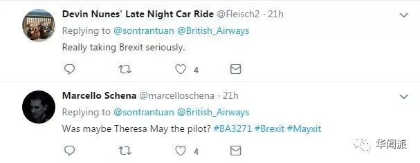 有些英国网友甚至把这次乌龙和“脱欧”以及梅姨联系起来,说梅姨其实是这架飞机的飞行员。