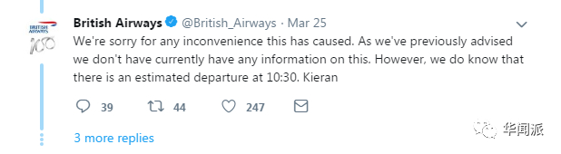 英航用推特作出了官方回应,“我们为造成的一切不便深感抱歉。目前,我们也并不清楚航班意外降落爱丁堡的原因。不过,我们已经计划在10:30再次起飞飞往杜塞尔多夫。”