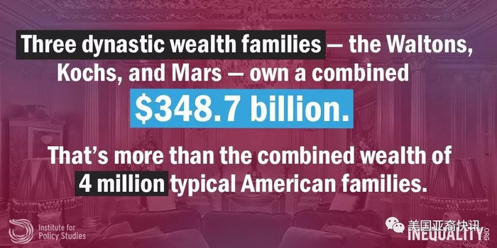 美国智库Institute for Policy Studies(IPS)对福布斯美国400富豪榜的分析发现,在美国最富有的400人中,有136人的财富来自于上一代人。这一比例为34%,约占整个榜单的三分之一。这些榜上有名的“富人后代”中,有7位来自沃尔顿(Walton)家族、两位来自科赫(Koch)家族、6位来自玛氏家族(Mars)。