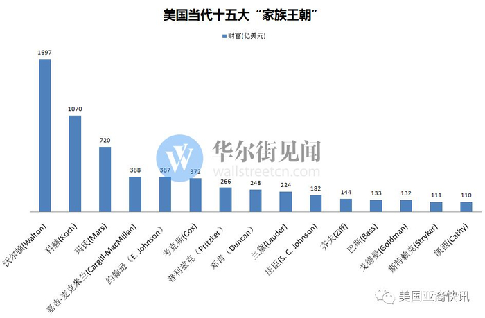这15个家族的总财富超过6180亿美元,超过了全球第22大经济体瑞典的GDP,相当于10个保加利亚的经济总和。其中,最富有的三个家族——沃尔顿、科赫和玛氏——家族财富经历了迅猛增长。