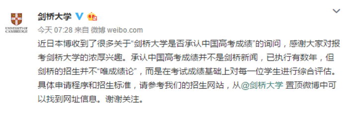 近日“剑桥大学接受高考成绩”的新闻上了微博热搜,逼得剑桥大学副校长出来辟谣。剑桥大学副校长大卫·卡德威尔(David Cardwell)教授表示,其实剑桥大学早在2005年就接受了中国高考成绩,而且高考分数只是参考因素之一。
