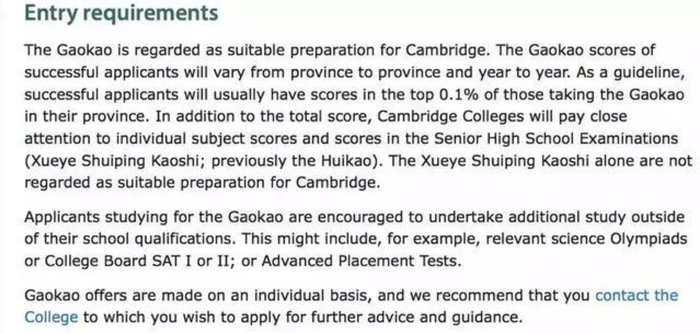 “高考被认为是剑桥的合适准备。 通过高考成绩成功申请者的得分每年会因省而异。 作为指导原则,成功申请者的成绩通常在其省内高考的人数中的前0.1%。 除总分外,剑桥大学还将密切关注高中考试中的个别科目成绩和分数(学业水平考试和会考)。只有学业水平考试成绩的学生不被认为是剑桥大学的合适申请者。”