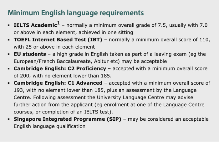 对于国际学生而言,申请剑桥大学的另一个难关是语言。剑桥大学要求本科申请者雅思总分不低于7,且单项不低于7.5。而英国很多大学的本科申请只要求雅思总分6分,单项5.5分。