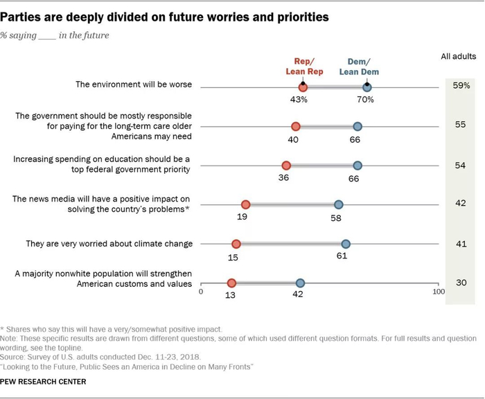 党派差异最大还是与环境有关的问题。大约61%的民主党人非常担心气候变化,而同意这一点的共和党人仅为15%。70%的民主党人预测未来30年环境状况将恶化,而43%的共和党人认可这点。