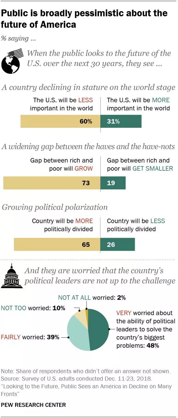 美国人在展望未来30年时,他们认为这个国家在经济,政治和世界舞台上都在衰退。虽然大多数公众(56%)表示他们对美国的未来持乐观态度,但当落实到具体问题时,希望变成了怀疑。