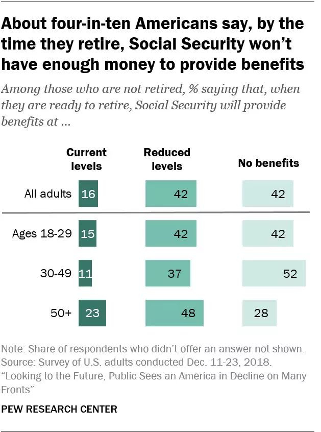 72%的美国人认为在2050年退休后的老年人的保障金将低于今天。83%的人预测大多数人将不得不努力工作到70多岁才能退休。公众对社会保障体系未来的预测显然是严峻的。