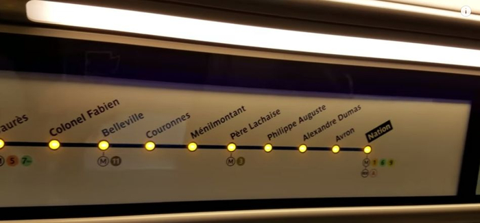 地铁车厢内的线路图。小编曾经在巴黎地铁1号线车厢内遭遇女性盗窃团体,其中一位以看不懂地铁线路图问站为由分散小编注意力,团伙其他成员下手偷包,还好被机智的小伙伴指出,窃贼未能得手。