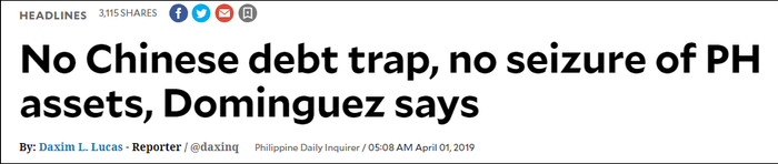 ▲ 菲律宾媒体《菲律宾每日询问报》4月1日报道,杜特尔特政府提出的总值约8万亿比索(1.02万亿人民币)的“大建特建”基础设施投资计划,引发了人们对该国陷入债务陷阱从而损害经济和主权的担忧。