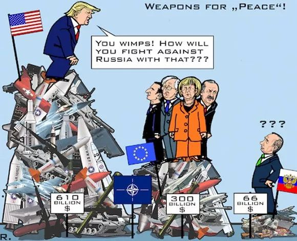 美国、欧盟和俄罗斯的军费对比。 图源:Toonpool