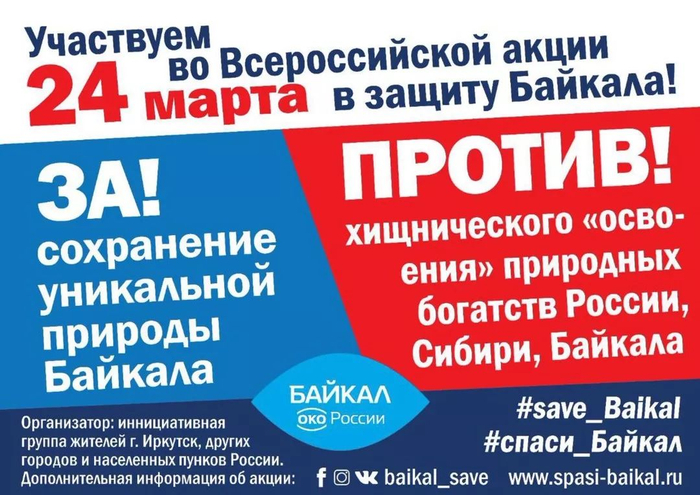 3月24日,全俄数十个城市举行了以“救救贝加尔湖”为题目的抗议集会,参与者中不乏公众人物,甚至还包括地方议员及官员。3月27日,由地方法院发布的最新审查报告称,该项目最初通过的环境评估及相关听证会“没有考虑到濒危迁徙鸟类以争议土地为季节性栖息地”,也“没有充分考虑珍稀植物的分布情况”。并且,在对在建工地的调查当中还发现了石油制品和废物堆放现象存在的痕迹。