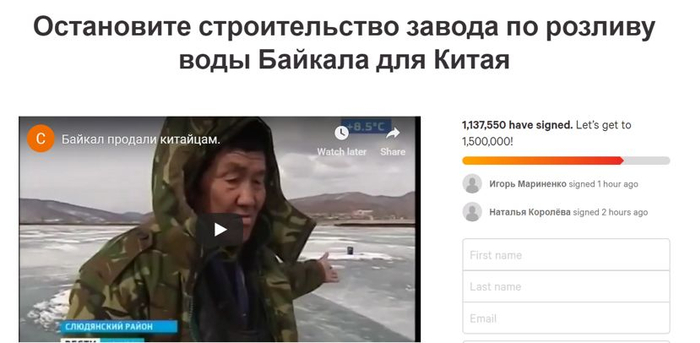 在请愿网站上,逾百万人签名反对的是“为中国建造的贝加尔湖瓶装水厂”。网络上流传的一封号召抗议集会的动员信中则写道:“在我们的湖边要建造一个中国工厂,从湖中抽出的水要被运到中国去……”
