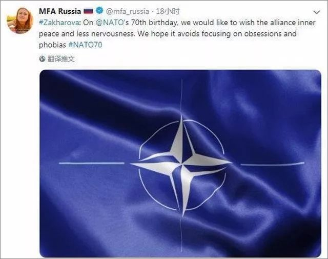 ▲ 俄罗斯外交部发言人扎哈罗娃上周四在北约成立70周年之际发表评论说,俄罗斯希望北约取得内心平静,不要那么紧张,“我们希望(北约)避免陷入过度执迷和恐惧。”