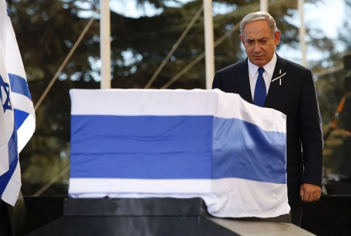●内塔尼亚胡站在以色列前总理西蒙·佩雷斯的棺木前,佩雷斯是以色列政坛”元老级“人物 / 视觉中国