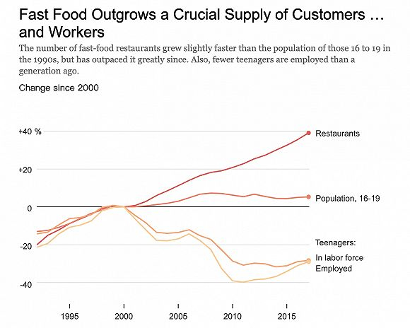 打工的青少年变少,最紧张的莫过于美国的连锁快餐店。由于菜品价格普遍较低,控制用工成本成为了提高利润的一大关键。但《纽约时报》在统计后指出,2000年至2018年,美国快餐店的数量增加了近40%,远远超过16至19岁人口的增幅,在此期间,进入劳动力市场就业的青少年人数减少了近30%。