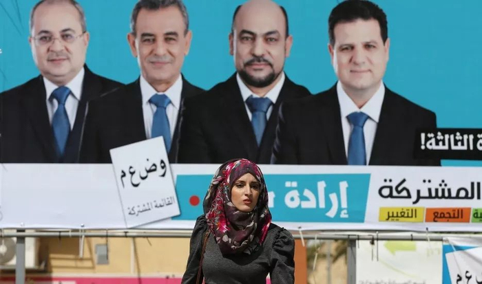 一名阿拉伯裔女子在“联合阿拉伯名单”政党的竞选广告前