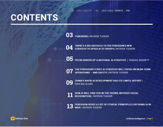 美国“防务一号”网站3月底发布最新《人工智能报告》称,美国国防部在2019年,将让人工智能真正成为现实。该报告分为六个部分,详细介绍分析了美国在人工智能上的最近真略进展;俄罗斯和中国在人工智能策略上的发展与弱点;AI技术上的重大突破;以及美国国防部应如何应对日益凸显的AI伦理问题等最新的重要议题。