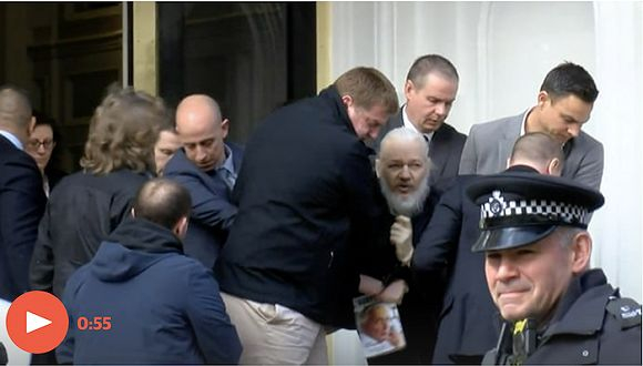 网上放出的视频显示,至少六名便衣警察将戴上手铐的阿桑奇强行带出使馆,送上警车。头发花白、衣衫褴褛的阿桑奇反复大喊“英国必须抵抗”。他手里拿着一本达尔的书——《国家安全的历史》(TheHistoryofTheNationalSecurityState),书中包括作者对美国安全机构的批评。