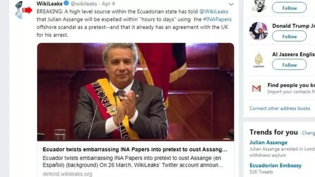 4月4日,维基解密就在推特上表示,厄瓜多尔已与英国就逮捕阿桑奇达成协议,阿桑奇可能在几小时或几天内被厄瓜多尔大使馆驱逐。
