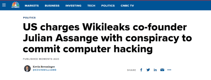 而据美国CNBC新闻网报道,美国11日对阿桑奇提出引渡请求后,美国司法部宣布对维基解密创始人阿桑奇提起刑事指控,指控他和美国前情报分析师曼宁密谋入侵美国政府的机密电脑,下载情报和数据,涉嫌“计算机犯罪”。