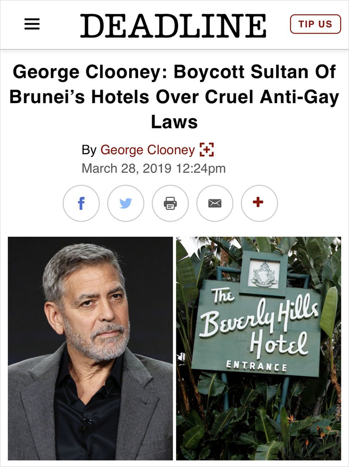 打响第一枪的是乔治·克鲁尼,他在deadline.com网站上连续发出两篇文章,呼吁社会抵制文莱苏丹通过文莱投资局所拥有的欧美九家奢侈酒店。