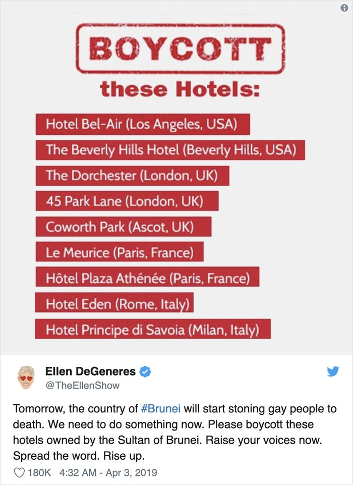 在欧美各国,和2014年那次一样,这段时间从政府官员、到商业公司、到明星名人和普通大众,很多人、很多机构都在积极发声,批评文莱政府的倒行逆施,发起参与抵制文莱的行动。