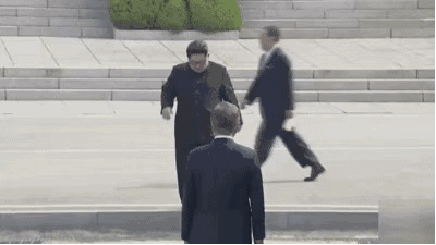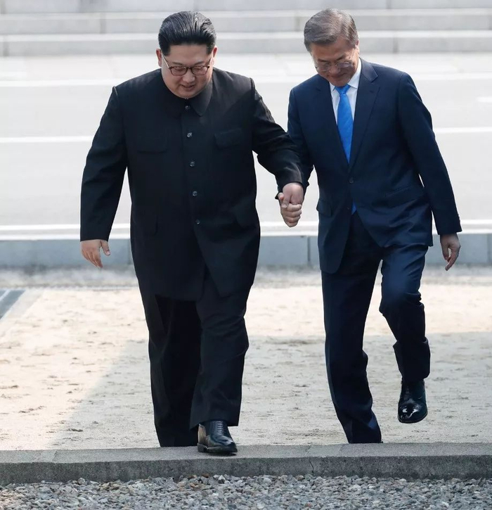 金正恩听闻此言,立刻握起文在寅的手,一同跨过分界线,到达朝方一侧。