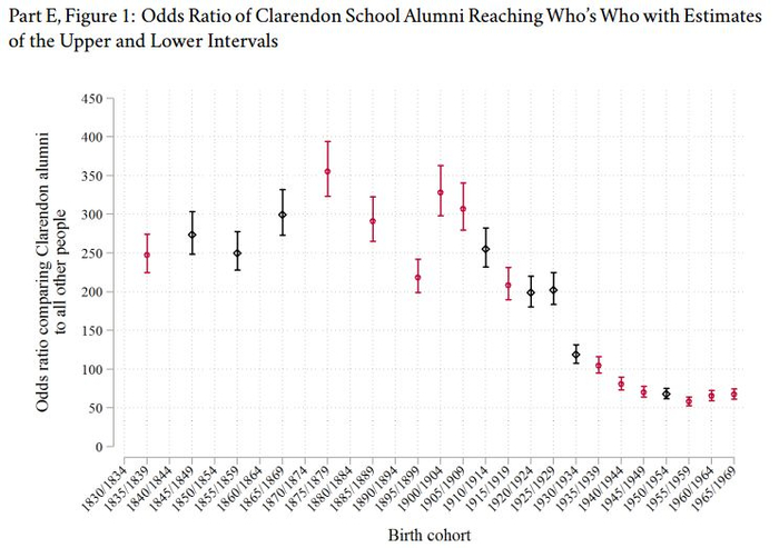 下列图表显示,如果一个1847年出生的英国男孩进入了克拉伦登学校的其中一所学校就读,那么他长大后入选《英国名人录》的几率是其他人的274倍;120年后,在1967年出生的英国男孩身上,这个几率减小到67倍。尽管这9所私校的影响力在近百年已经锐减,但进入其中一所对成功跻身精英群体的影响仍然高得吓人。那些能就读克拉伦登学校的男孩子们几乎个个都出身世家。毕业以后就读牛津剑桥,继而进入精英阶层,延续家门的荣光,这些对于他们来说似乎是一条康庄大道,得来全不费功夫。这群人在英国有一个特别的称呼,“theoldboy”。