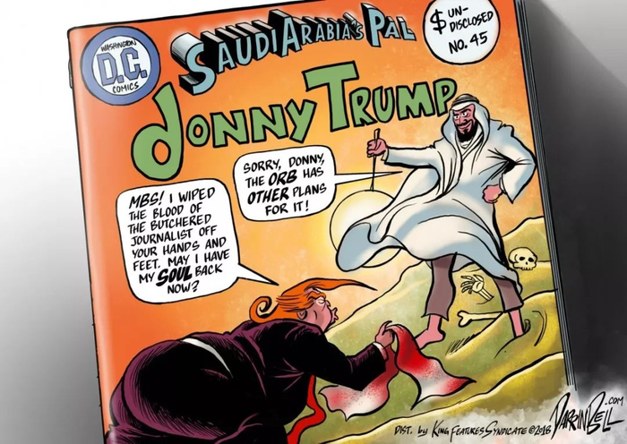 《华盛顿邮报》专栏作家卡舒吉被谋杀后,川普拒绝惩罚沙特,这幅漫画讽刺了他“跪舔”沙特王储MBS。