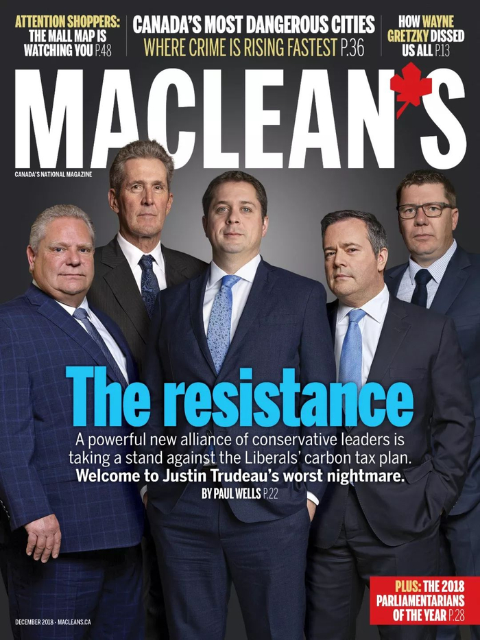 联邦保守党领袖谢尔(Andrew Scheer,中),安省省长福特 (Doug Ford,左一),曼省省长帕利斯特(Brian Pallister,左二),阿省省长康尼(Jason Kenney,右一)和萨省省长莫伊(Scott Moe,右二)组成新的保守派联盟