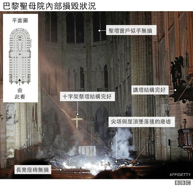 大火后,全世界除了关心大教堂损毁状况,更关心如何修复。根据BBC资料,大教堂内外损毁程度如下: