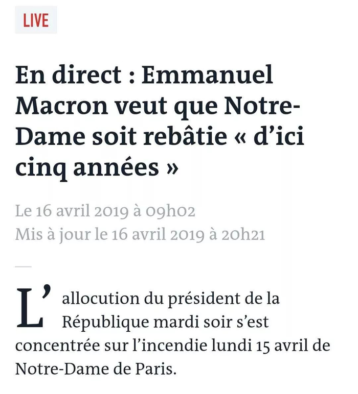 “纵观我们的历史,我们建造了城市、港口和教堂。这其中有许多被烧毁、摧毁。但是我们每一次都能重建。圣母院的大火提醒我们,历史永不会结束。我们总能克服困难……我们将把圣母院重建得更美丽。我想在五年内完成重建。”