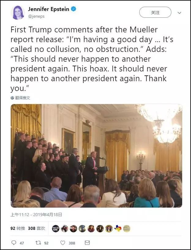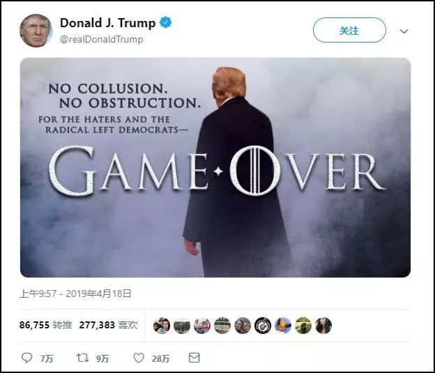 特朗普上午10点发表推文称,“没有勾结,没有妨碍。对于仇恨者和激进的左翼民主党人来说,游戏结束了”。