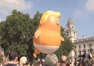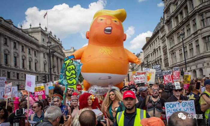 去年特朗普访问英国期间,一个巨大的“特朗普宝宝”充气气球被升上了天空,还有上千名示威者聚集在了伦敦市中心抗议特朗普来访。