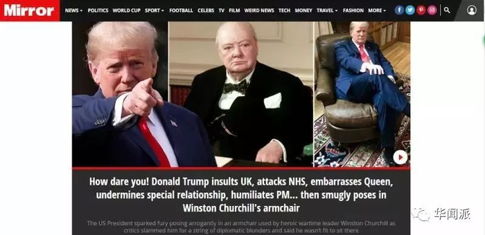 《每日镜报》直接说:“好大的胆子!唐纳德·特朗普羞辱英国,攻击公费医疗体系,让女王尴尬,破坏英美特殊关系,侮辱英国首相……然后还竟然坐在丘吉尔的扶手椅上自以为是地凹造型!”