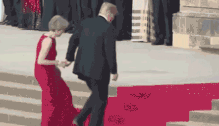 当两人牵手走过布莱尼姆宫(中国人俗称“丘吉尔庄园”,这里是丘吉尔出生的地方)的时候,有五级台阶,但刚走上第二级的特朗普,就把原本牵着梅姨的手半路撒开。两人之间的空气仿佛就这么凝固……还好梅姨反应快,顺便就伸出了另一只手做出了邀请特朗普往前走的动作。