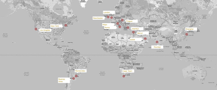 除了以上的高新制造业,连锁服务业,纺织业,我们还发现一种新的全球化形态,这家企业也是我们的老朋友---赤马传媒。赤马传媒为大量顶级企业拍摄过脍炙人口的广告片。这类企业的全球化路线,和别的行业完全不同。(下图是赤马在全球的联合office布局图)