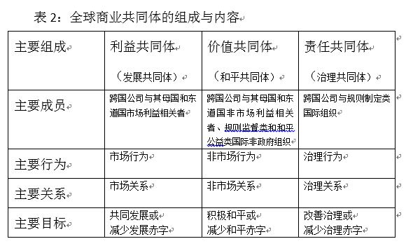 根据“一带一路”倡议的精神和原则以及构建人类命运共同体的要求,中国企业共建“一带一路”的目标模式应是全球商业共同体,即基于某个全球性商业场景,以其中的跨国公司及其利益相关者为成员的群体。具体内容见表2: