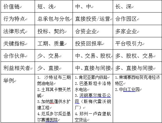 通过分析会议研讨的10个项目,可归纳出中国企业共建“一带一路”的三种典型模式,见下表1: