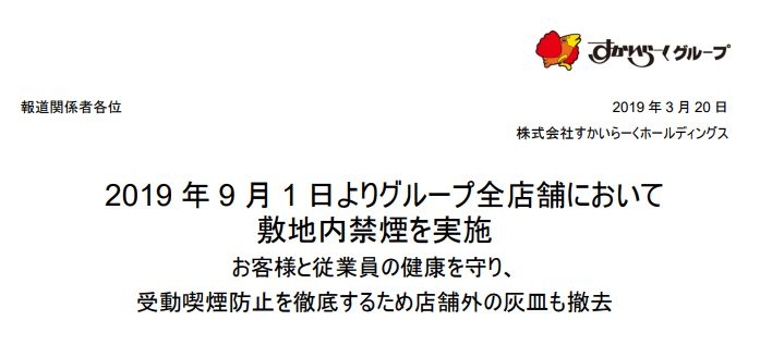 将从9月起在所有店铺实施禁烟