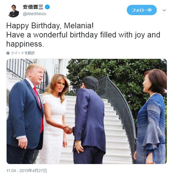 访美期间,安倍晋三发推祝福梅拉尼娅生日快乐。