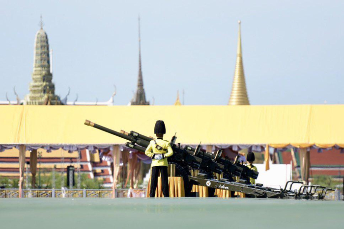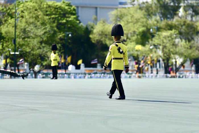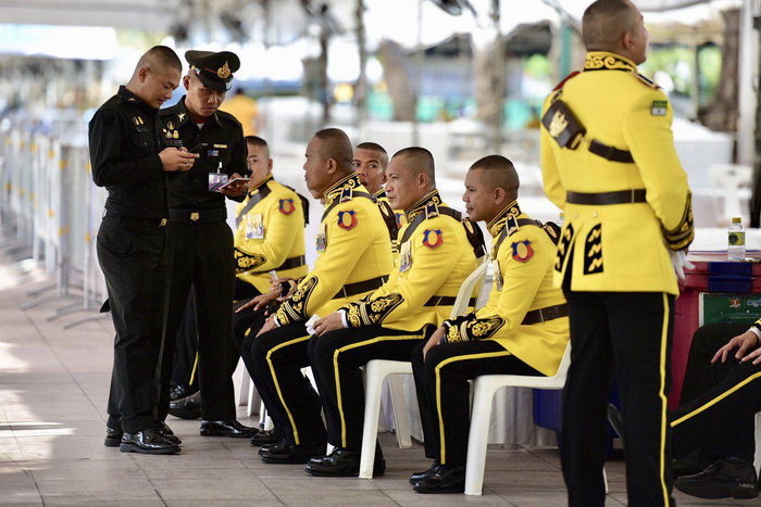 在曼谷街头,加冕仪式的工作人员正在待命中。