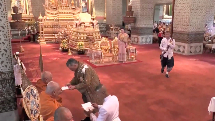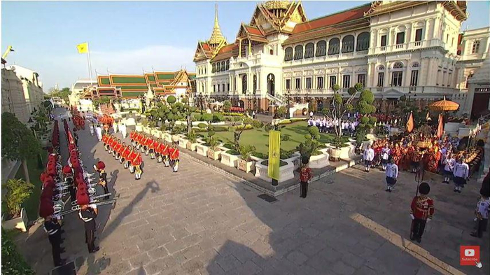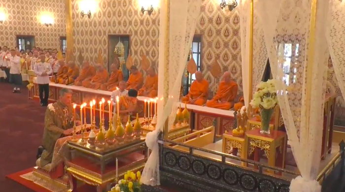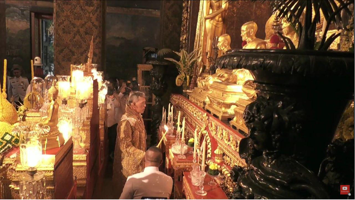 泰国国王哇集拉隆功前往玉佛寺进行祈福。他乘坐轿子抵达玉佛寺,共有80位僧侣和国王一起祈福,也宣布自己是佛教的皇家赞助人。