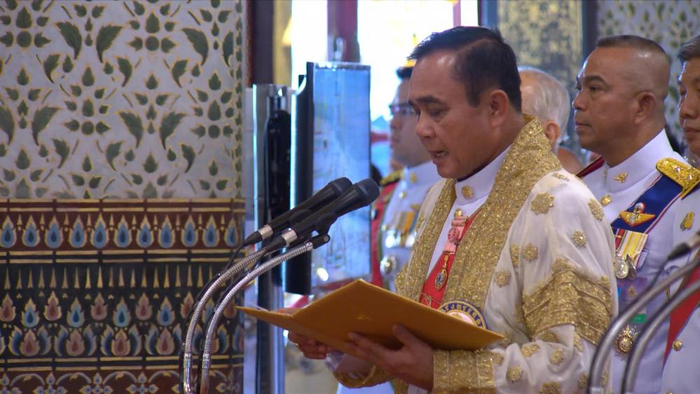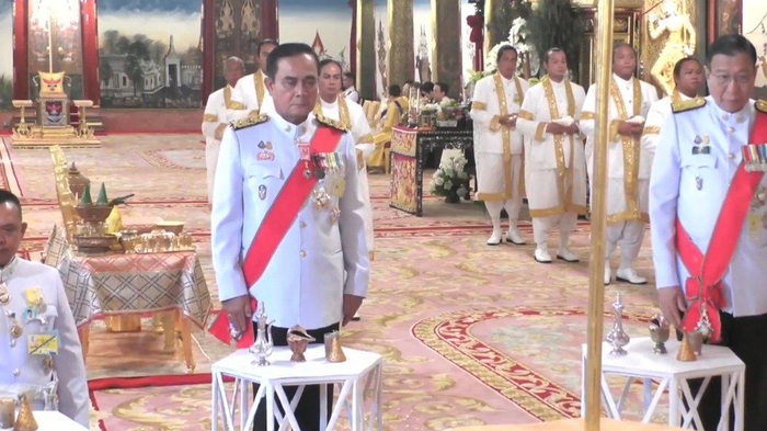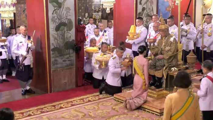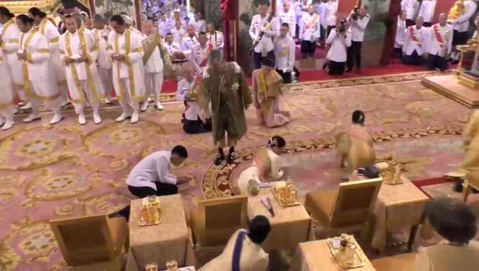 净化仪式结束后,哇集拉隆功坐在木雕宝座上,接受来自8个方向的圣水。泰国总理巴育位于“西方向”,向国王奉上圣水。